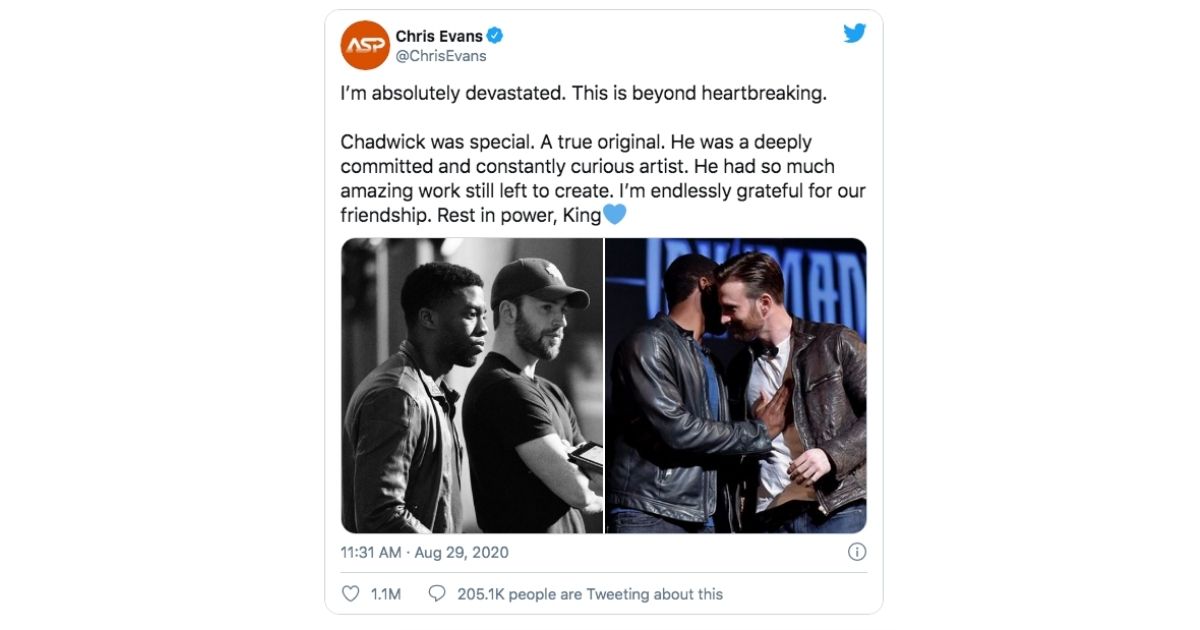 Captain America actor Chris Evans tweeted: “I’m absolutely devastated. This is beyond heartbreaking. Chadwick was special. A true original. He was a deeply committed and constantly curious artist. He had so much amazing work still left to create. I’m endlessly grateful for our friendship. Rest in power, King.”