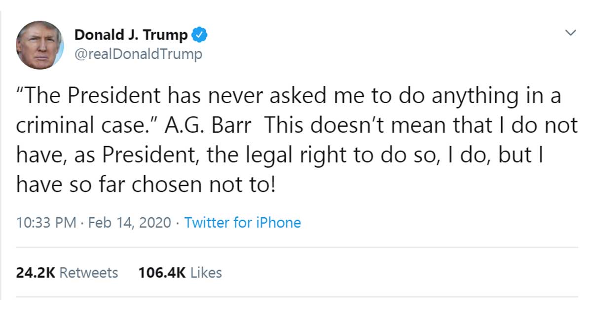 However, Trump ignored Barr’s request and pointed out that it is his legal right to intervene in criminal cases, as he continued to tweet about various DOJ cases including that of his confidante Roger Stone.