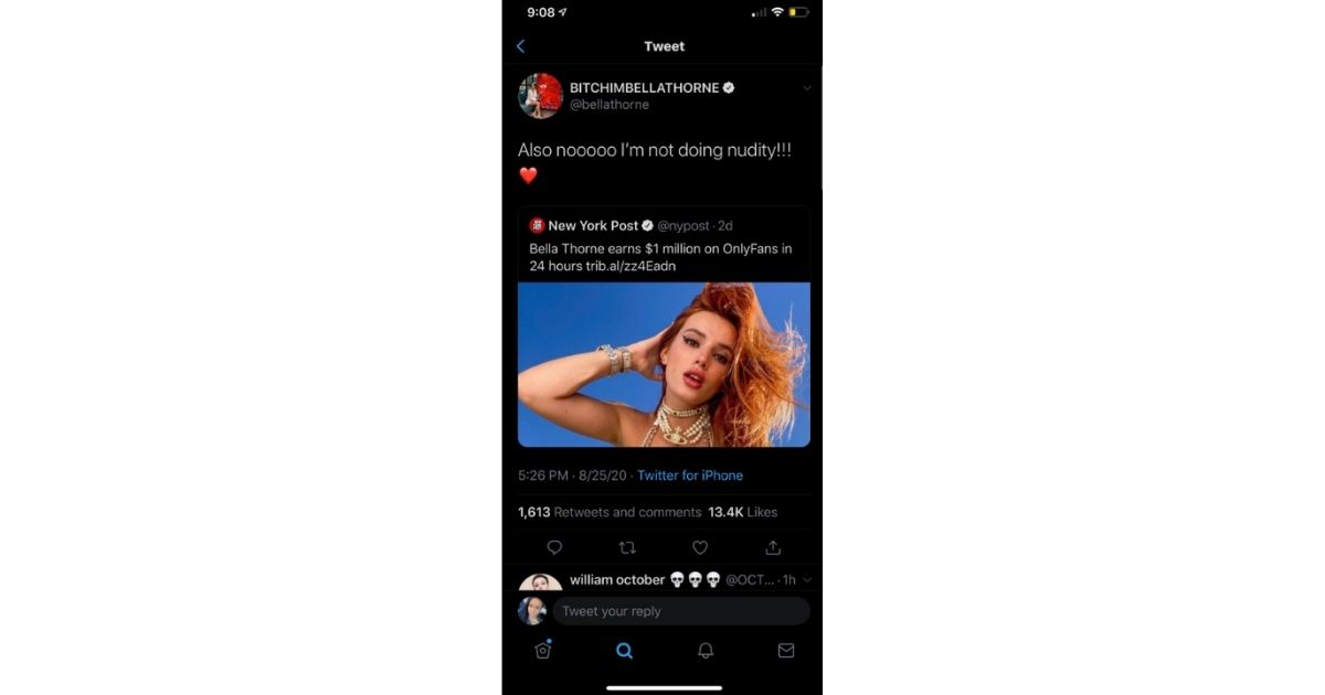 But, a subsequent screenshot of her sharing an article about her OnlyFans account appears to contradict this, quoting Thorne as saying: “Also noooo I’m not doing nudity!!!”