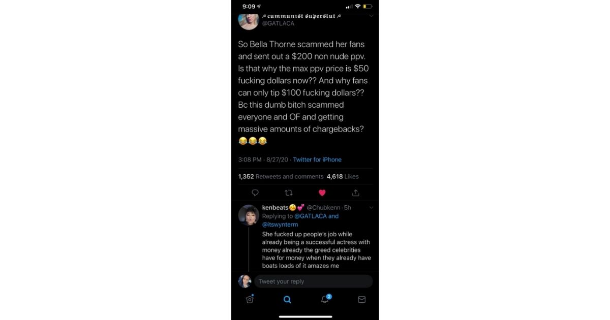 “So Bella Thorne scammed her fans and sent out a $200 non-nude pay per view. Is that why the max pay per view price is $50 f*cking dollars now?? And why fans can only tip $100 f*cking dollars?? Because this dumb b*tch scammed everyone and OnlyFans and getting massive amounts of chargebacks???” one content creator blew the frustration on Twitter.