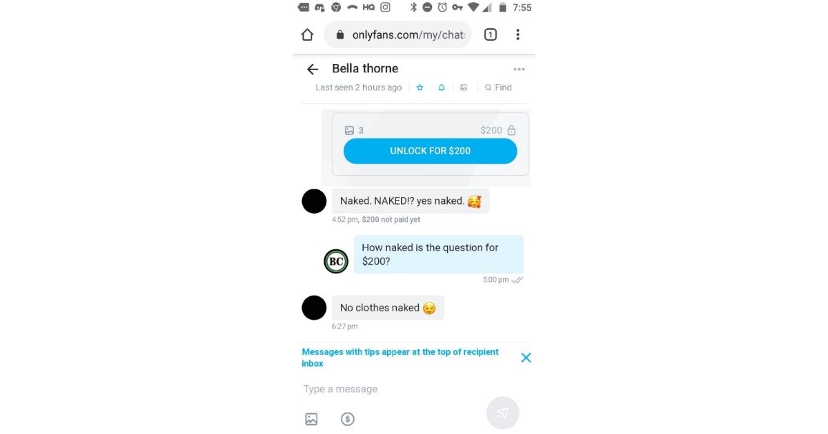 A screenshot shared to Twitter alleges to show Thorne promising ‘no clothes naked’ content to a subscriber if they unlock three extra images at the expensive price tag of $200.