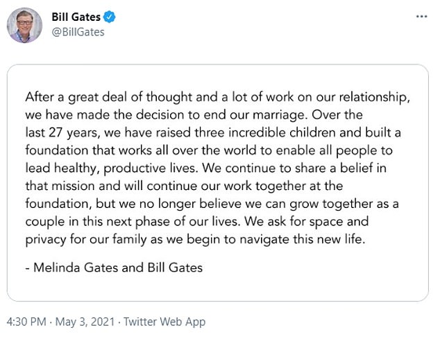 The famous Microsoft co-founder recently tweeted at about 4:30 pm EST how they have put a great deal of thought as well as work into their relationship of 27 long years. However, they have now decided to put an end to their marriage.