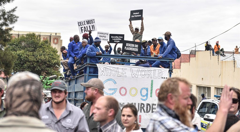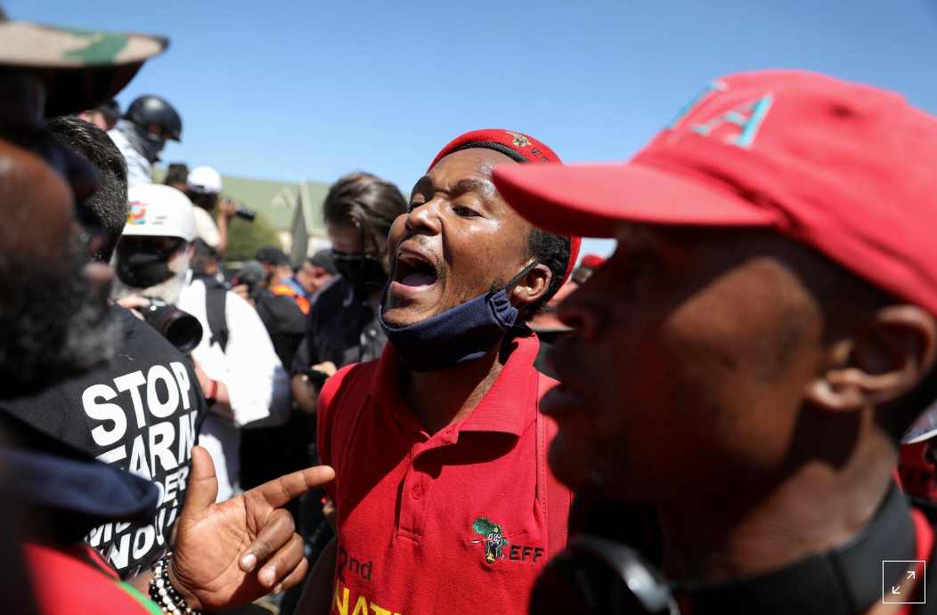 At today’s standoff, some demonstrators arrived in military outfits while others donned flags and banners with ‘Boer Lives Matter,’ written over them.
