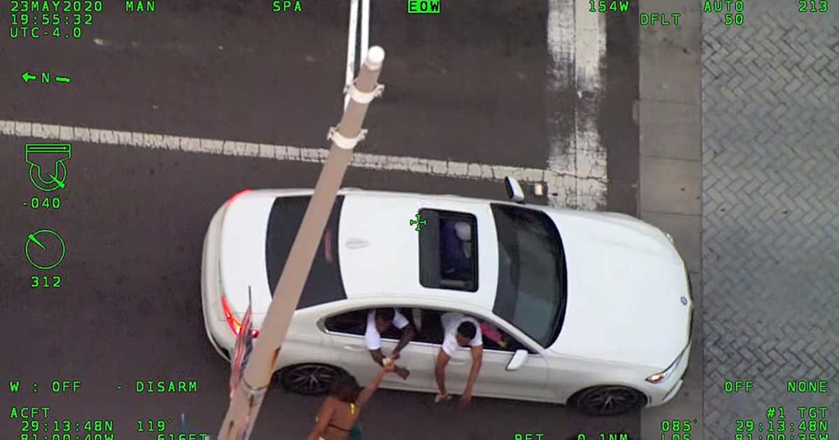 Some were seen surrounding a car outside a beachfront mall as a man stood on the sunroof and other men hung out the windows throwing money around and blocking traffic.