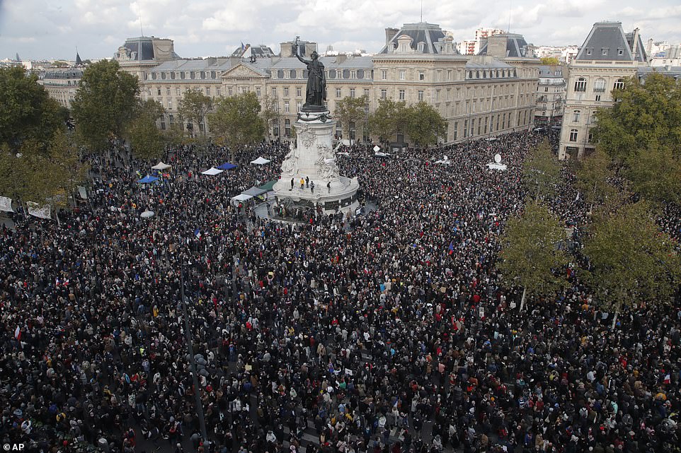 In Paris, thousands of demonstrators, including Prime Minister Jean Castex, gathered at the Place de la Republique to pay tribute to a history teacher who was inhumanly beheaded for showing cartoons of the Prophet Mohammed to his class.
