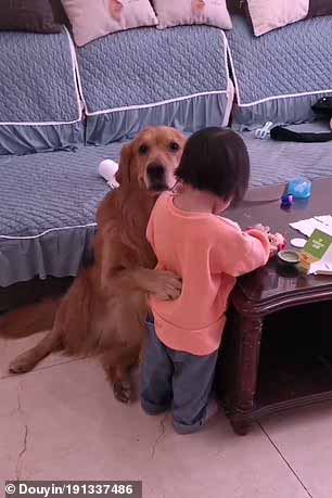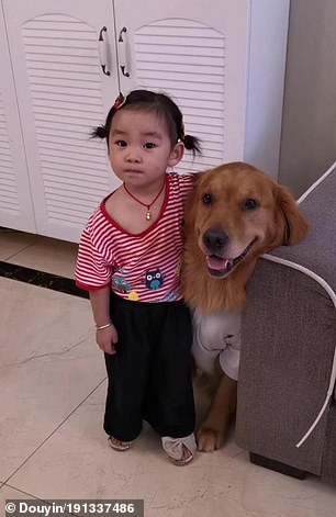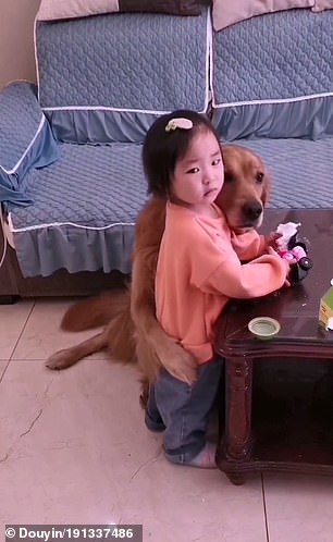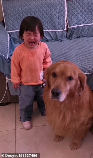 Viral video footage in China showed a loyal golden retriever protecting a crying girl from her mom’s loud scolds.