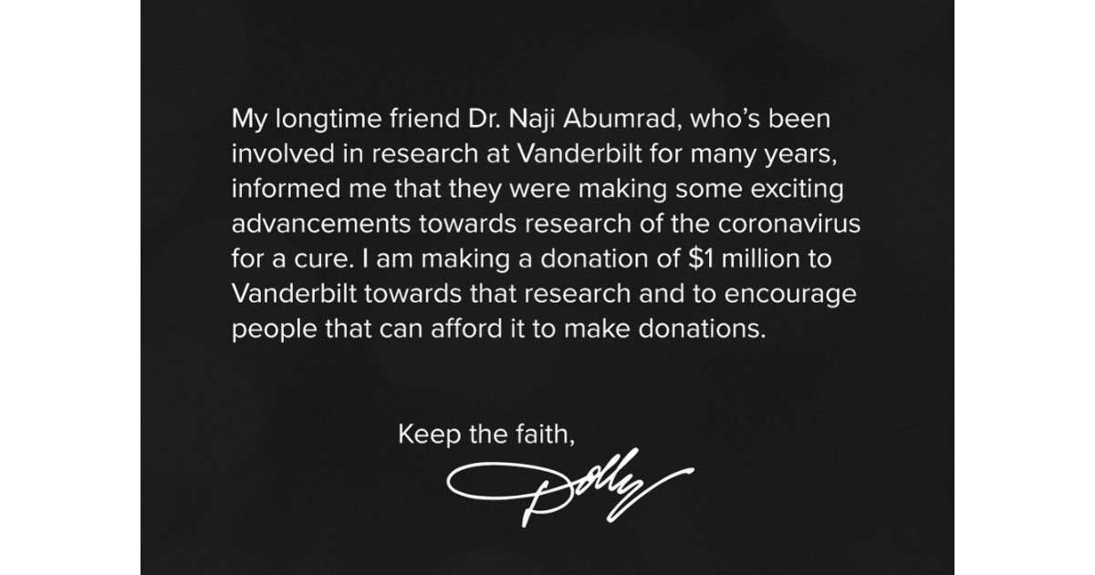 In April, less than a month after Covid-19 was officially declared a pandemic, Parton donated $1 million to Vanderbilt University’s research.