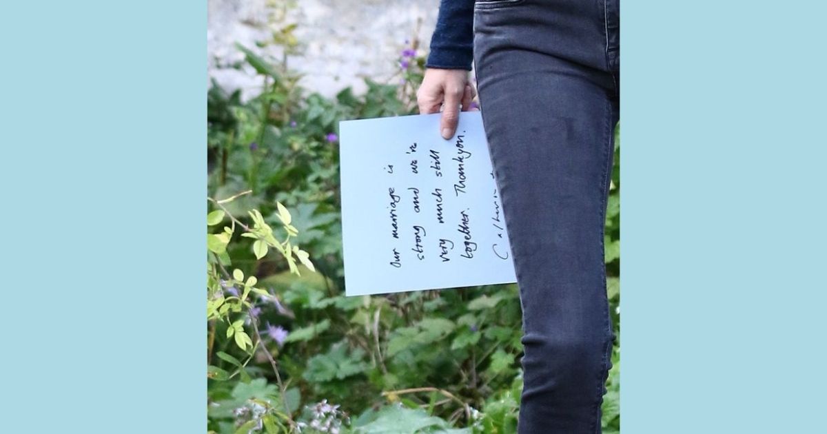 Dominic and Catherine put on a defiant display as they stood outside their home, held hands, and kissed. As they walked side by side, Catherine was seen carrying a hand-written note that reads: “Our marriage is strong and we’re very much still together. Thank you.”