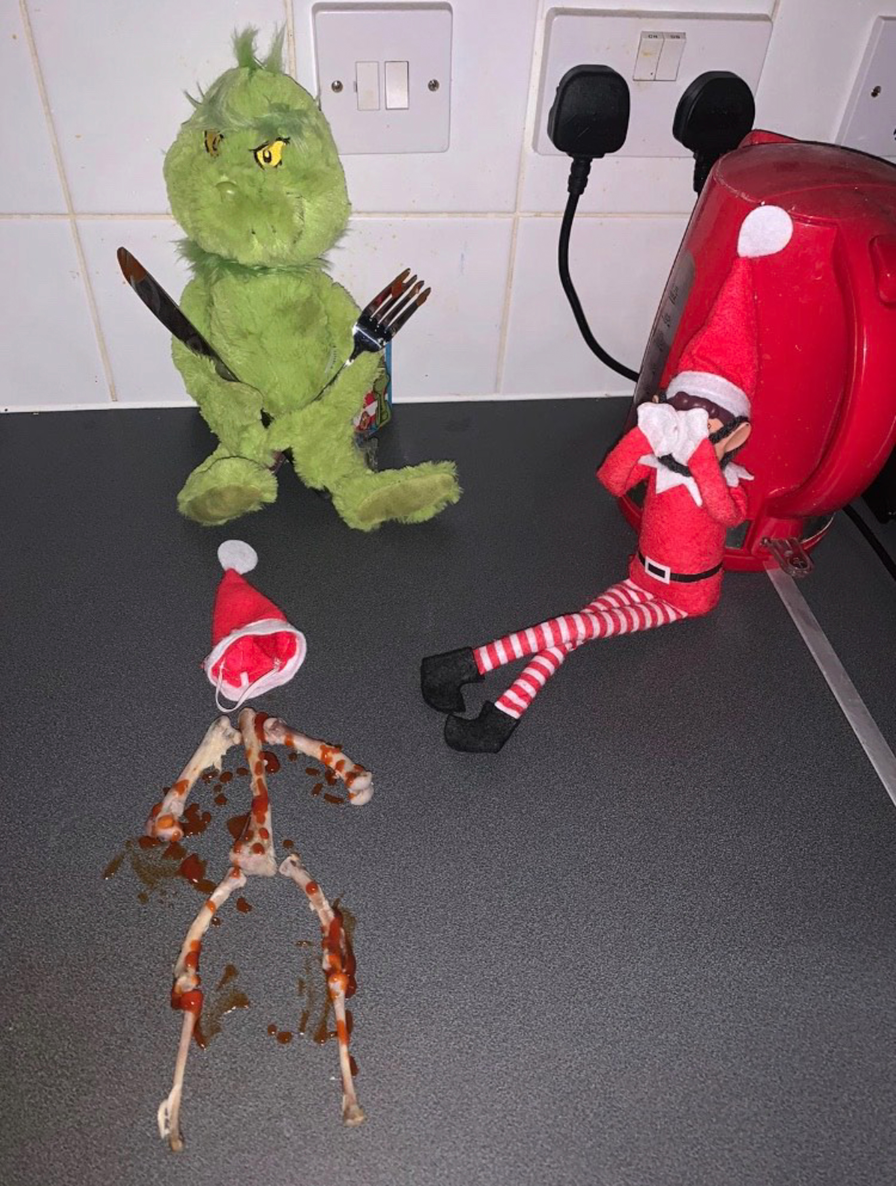 However, they appear shaped like a skeleton with plenty of ‘blood’ on its side. Let’s not forget the ‘blood’ present near the Grinch toy itself, which holds cutlery too. For this reason, you really get the vibes that the Grinch devoured the little elf with great pleasure.