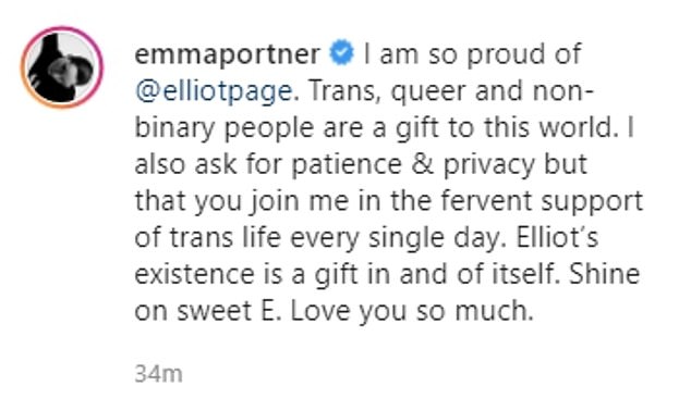 After Elliot tweeted his announcement, his wife, Emma, showed her support and wrote on Instagram, “I am so proud of @elliotpage. Trans, queer and non-binary people are a gift to this world.”
