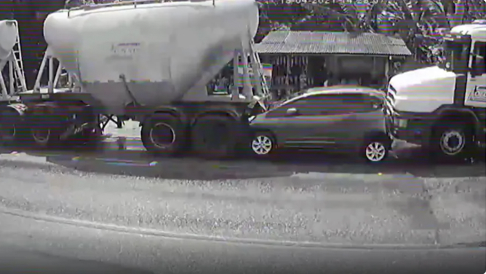 The footage shows that a truck was fast approaching a car behind a slow-moving truck. In a split second the family car can be seen to become completely crushed between huge vehicles.
