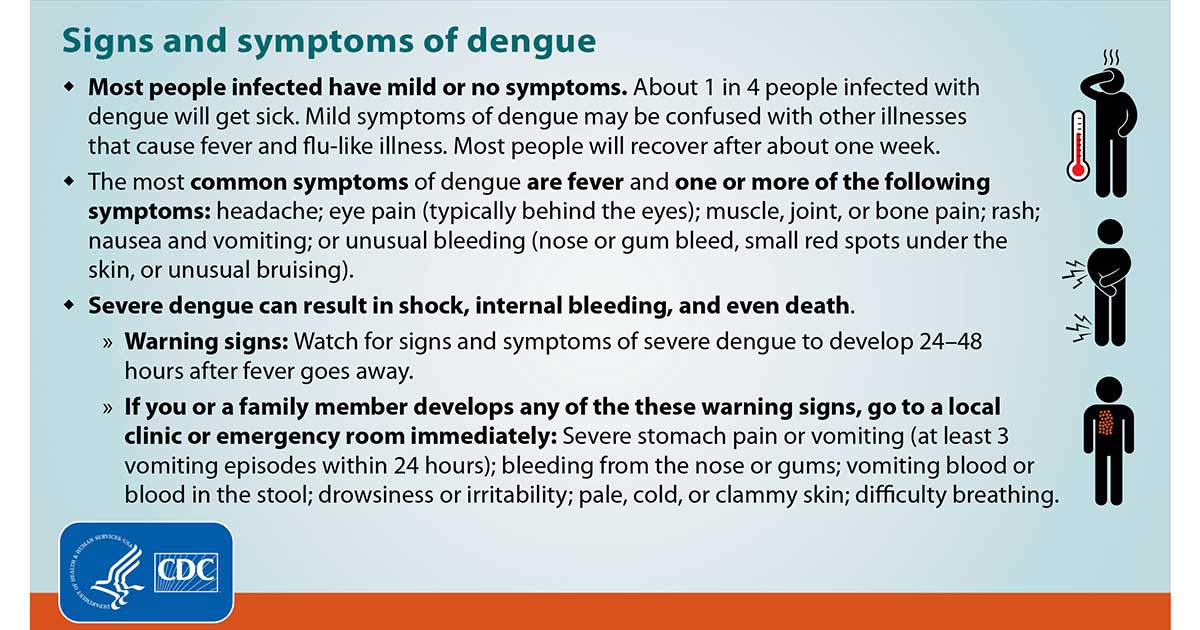 Symptoms include fever, severe headache, muscle and joint pain, abdominal pain, loss of appetite and widespread rash.