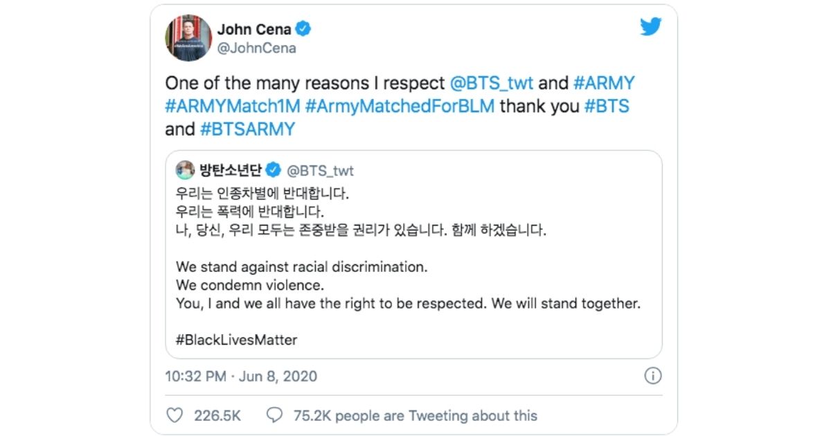“BTS donated a million bucks to Black Lives Matter and Army was like, if they can do it, we can do it. Fans who are already coming out of their pocket to support artists came out of their pocket more for charity,” Cena said. “And it’s not the first time that they’ve done this. This BTS Army charity gives a bunch to philanthropic causes.”