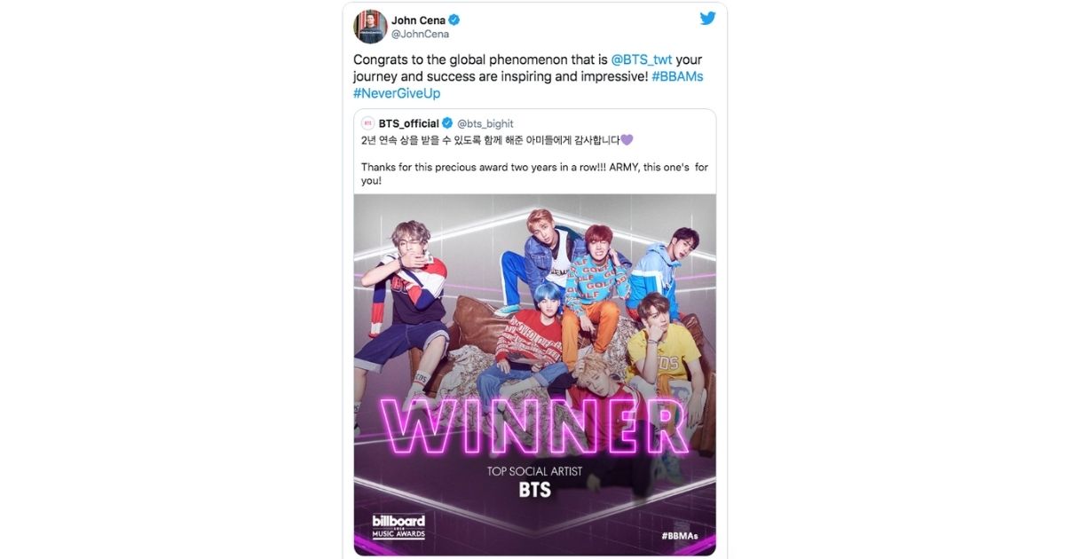 Cena first implied his love for BTS in February 2018, when he posted a picture of J-Hope to his Instagram page. The post was the first of many to come, and the BTS Army came to realize that he didn’t just like their music, he also shared in their message of self-love and positivity.
