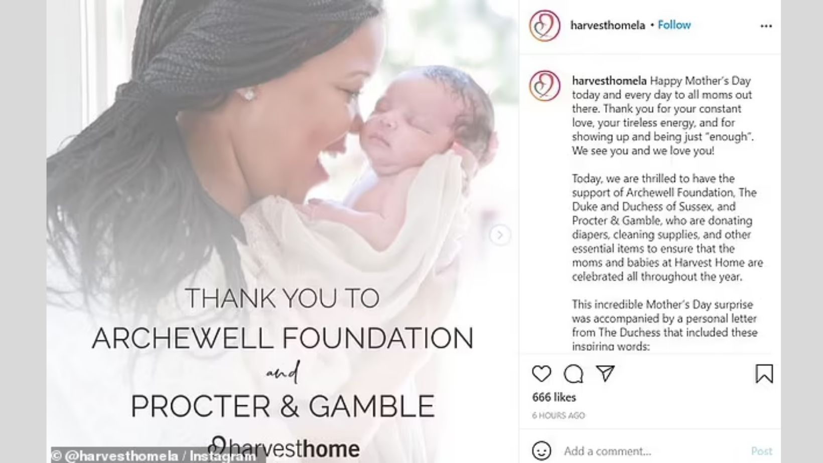 “Today, we are thrilled to have the support of Archewell Foundation, The Duke and Duchess of Sussex, and Procter & Gamble, who are donating diapers, cleaning supplies, and other essential items to ensure that the moms and babies at Harvest Home are celebrated all throughout the year,” the caption of the post reads.