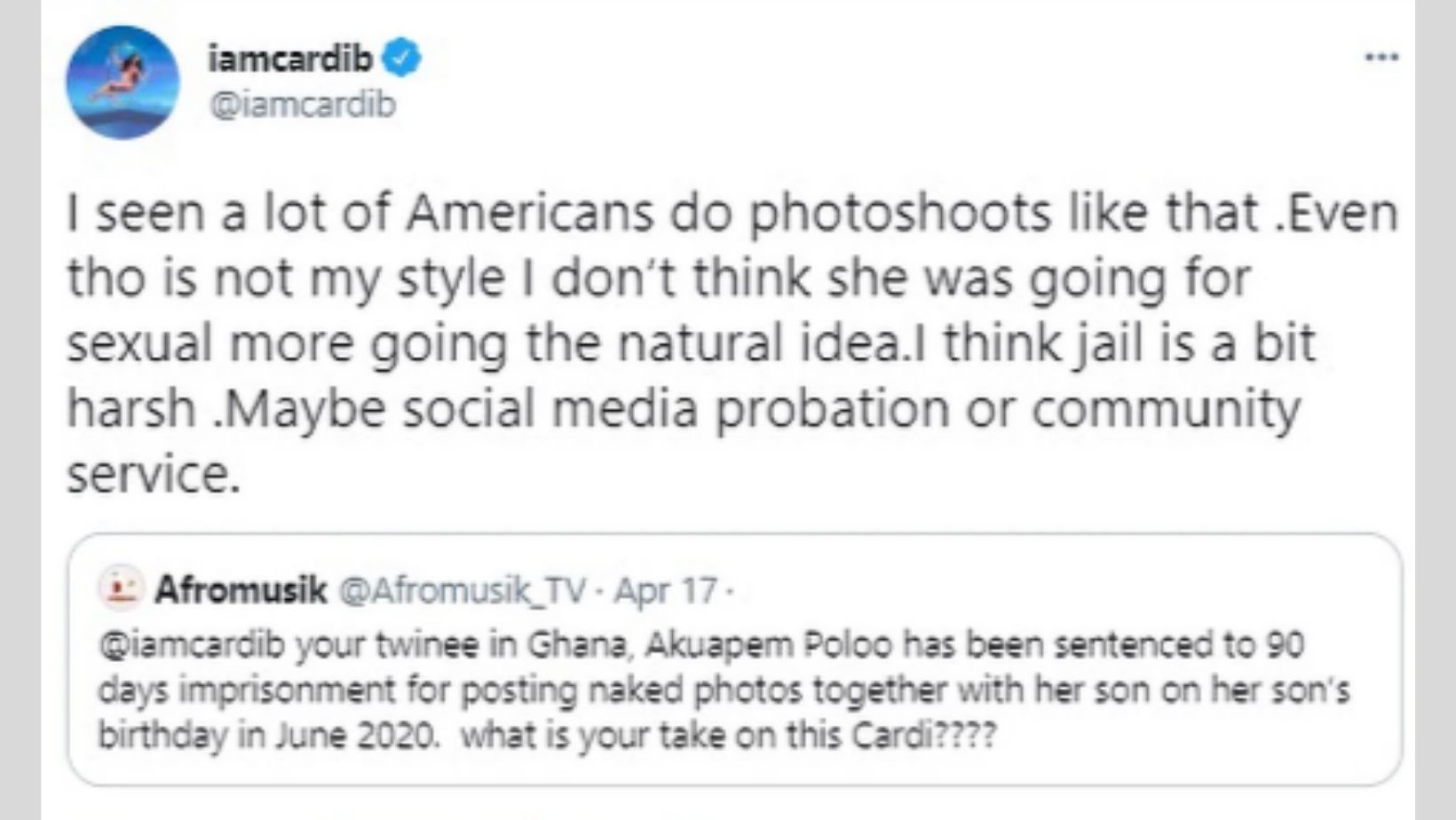“I seen a lot of Americans do photoshoots like that,” Cardi B tweeted. “Even tho is not my style I don’t think she was going for sexual more going the natural idea.”