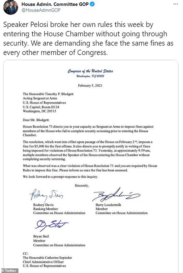 Republicans want House Speaker Nancy Pelosi to pay $5000 for breaking her own metal detector rules.