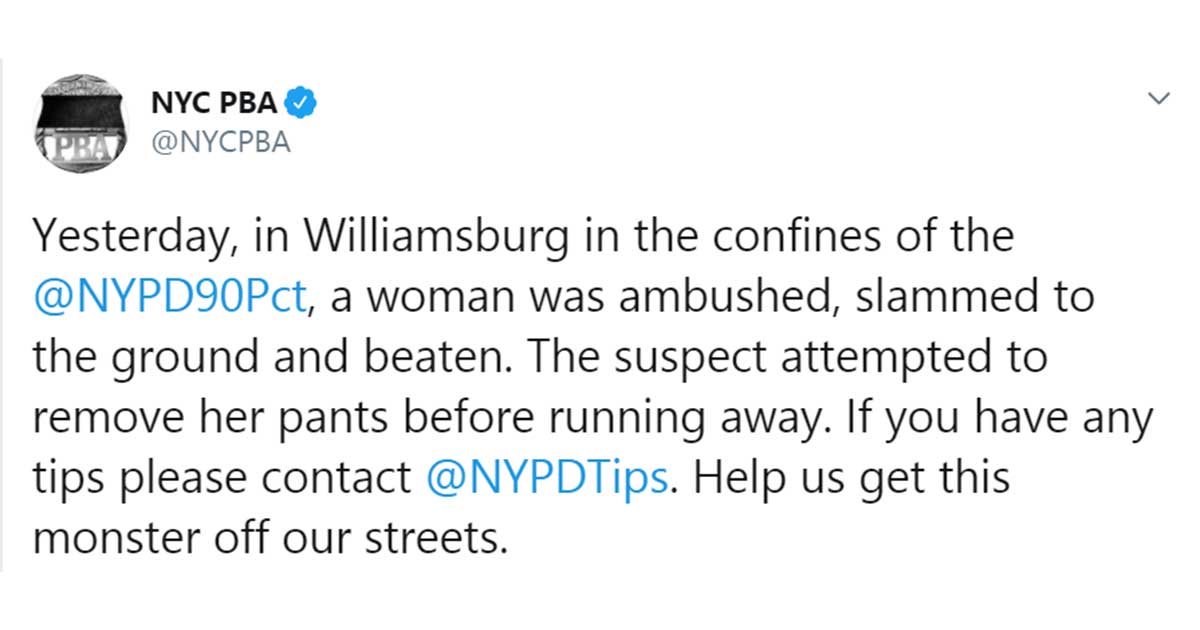 The victim is a 46-year-old woman, who was walking on Division Avenue near Rodney Street when an unidentified man aggressively approached her from behind, picked her off the ground and slammed her to the sidewalk.