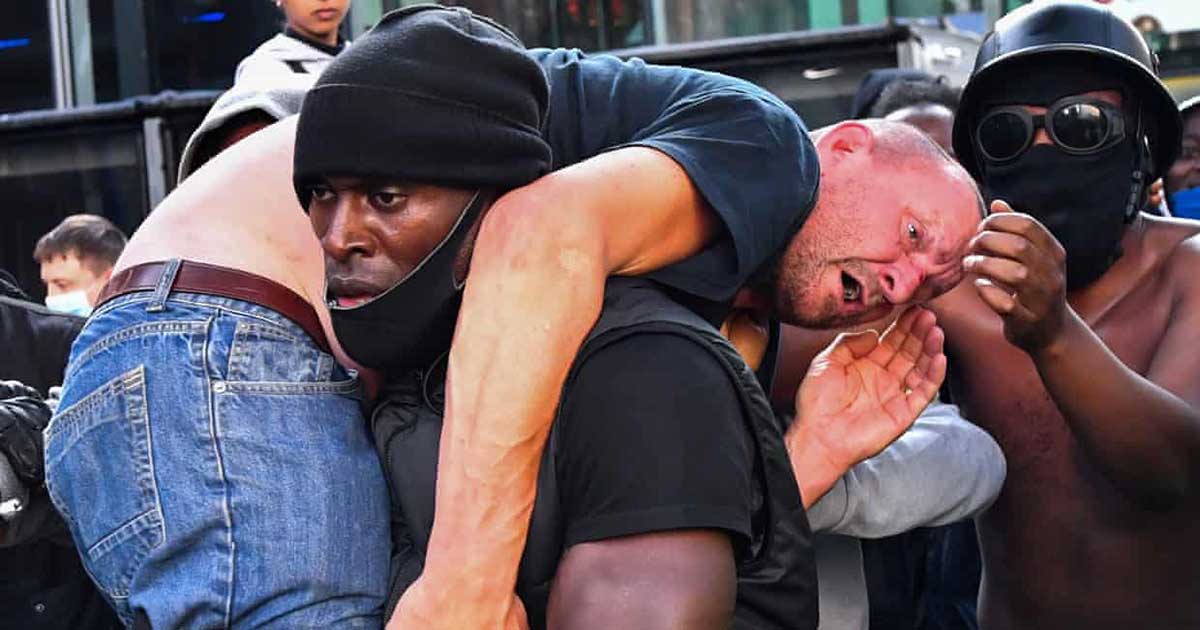 Describing his actions, Hutchinson said, “His life was under threat, so I just went under, scooped him up, put him on my shoulders and started marching towards the police with him.”