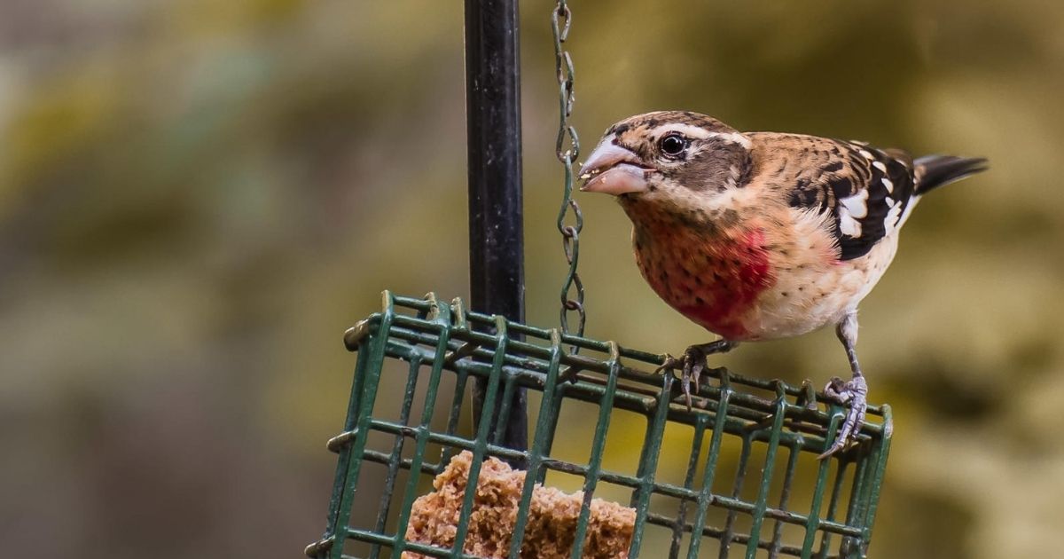 The bird was identified as a Rose-breasted Grosbeak. Male and female Grosbeaks are distinguished by their color, males have pink “wing pits,” while females are yellow-brown.