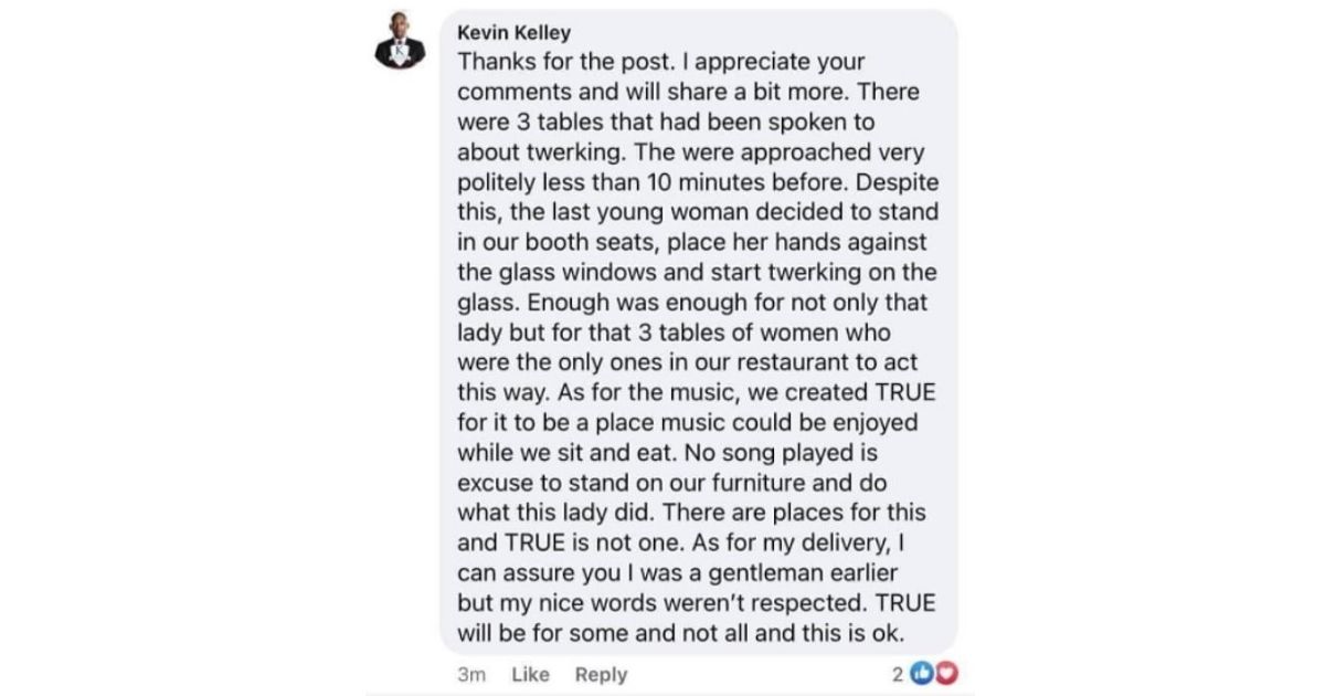 “We created TRUE for it to be a place music could be enjoyed while we sit and eat. No song played is excuse to stand on out furniture and do what this lady did,” Kelley wrote, referring to the woman captured on camera. “As for my delivery, I can assure you I was a gentleman earlier, but my nice words weren’t respected. TRUE will be for some and not all and this is ok.”