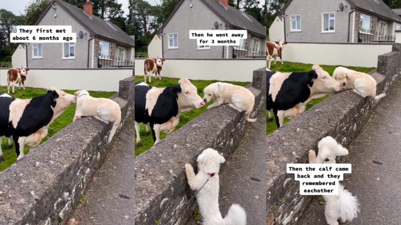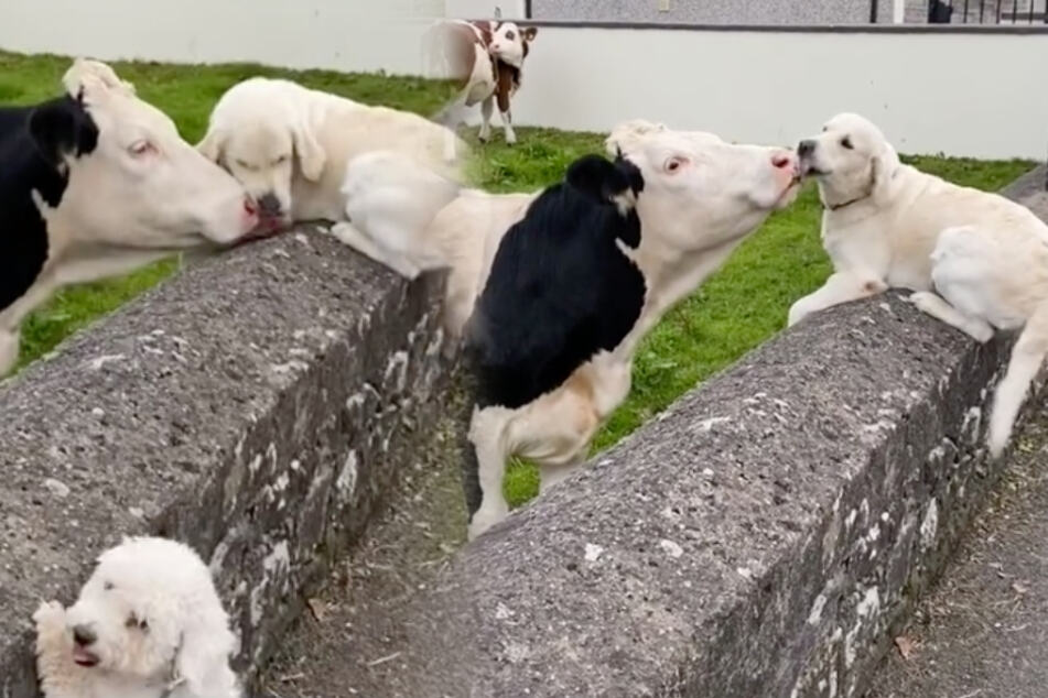 A heartwarming clip showing a cute golden retriever pup reuniting with a cow is going viral.