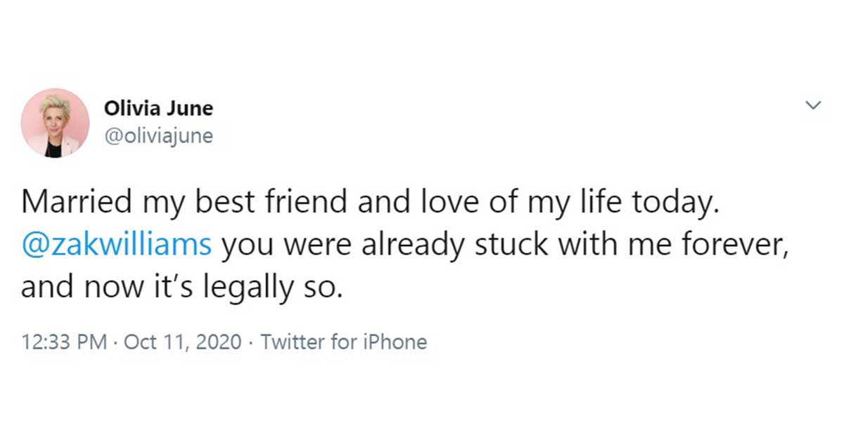 June added her own celebratory message on Twitter, who wrote, “Married my best friend and love of my life today. @zakwilliams you were already stuck with me forever, and now it’s legally so.”