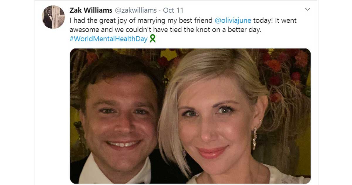 “I had the great joy of marrying my best friend @oliviajune today! It went awesome and we couldn’t have tied the knot on a better day. #WorldMentalHealthDay,” announced Williams on Twitter, posted together with a selfie of the couple.