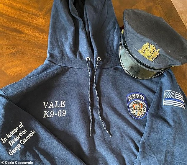 The sweatshirt was designed by the daughter of Transit Police Detective George Caccavale, who was shot dead in 1976. She sold the designs to raise and collect money for police; later, the K9 dog was named Vale in tribute to her father.