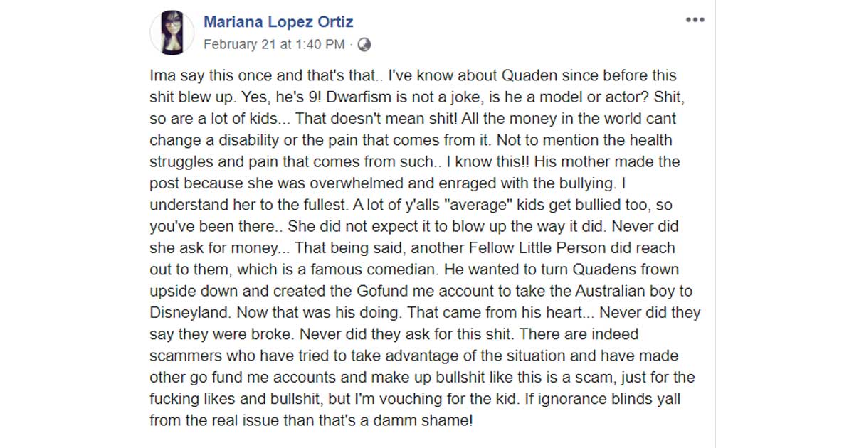 One of the posts she shared is written by a woman who said she has “known Quaden since before this s**t blew up.”