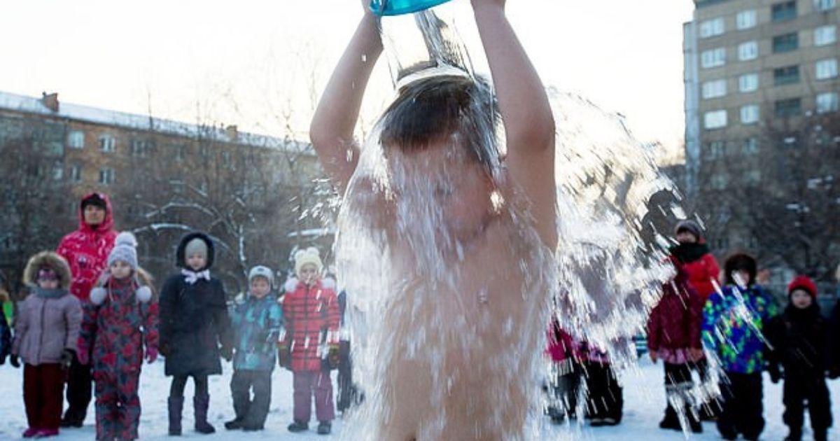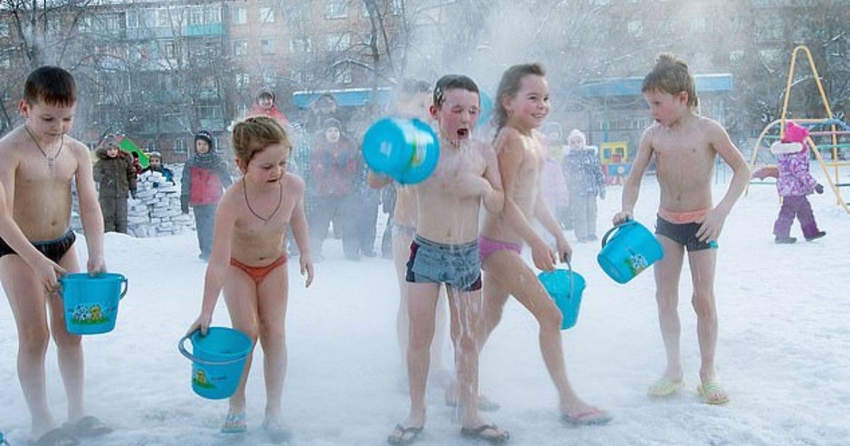 In Krasnoyarsk, Siberia, children at a kindergarten strip to their underwear and throw themselves with a bucket of ice water as part of the curriculum.