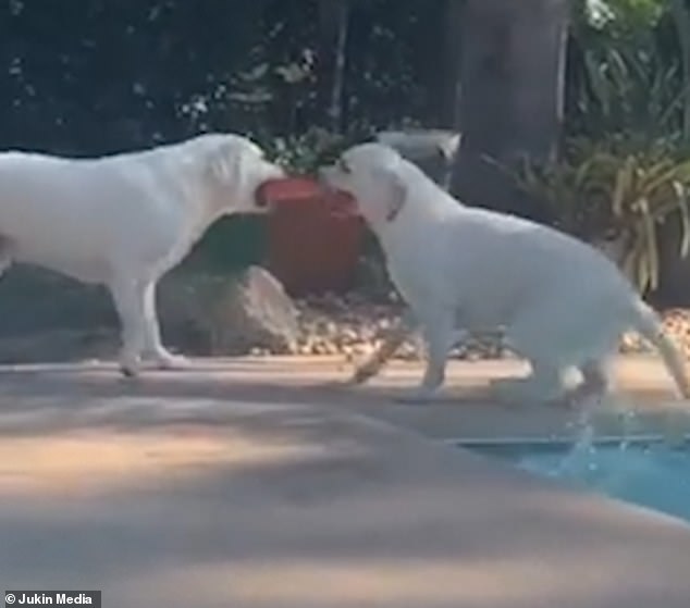 In the video, the pooch gets a hold of an orange-colored chewable toy. Situated on the side of the pool, the pup acts quickly, making sure his sister catches his throw. Soon enough, she bites it in no time and before you know it, it’s all smooth sailing.