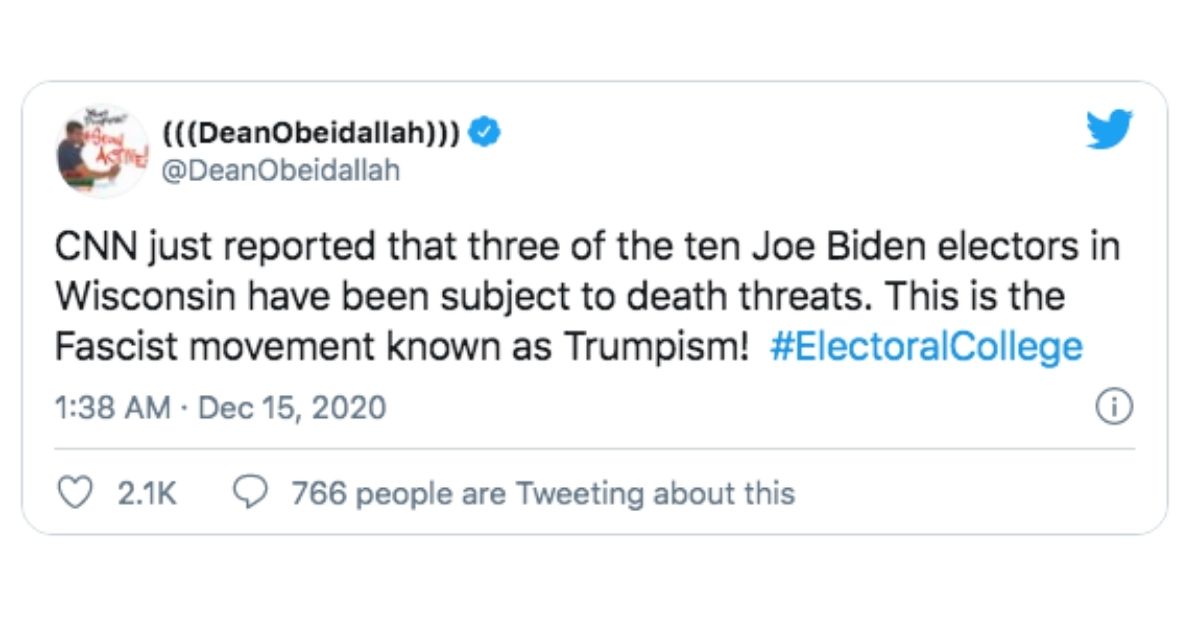 “CNN just reported that three of the ten Joe Biden electors in Wisconsin have been subject to death threats. This is the Fascist movement known as Trumpism!” Radio host and columnist Dean Obeidallah also tweeted.