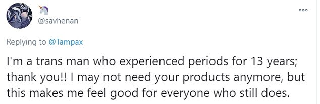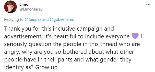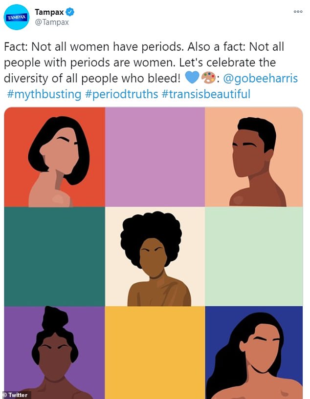 The sanitary towels and tampon company tweeted: Fact: Not all women have periods. Also a fact: Not all people with periods are women. Let’s celebrate the diversity of all people who bleed. #mythbusting #periodtruths #transisbeautiful.’