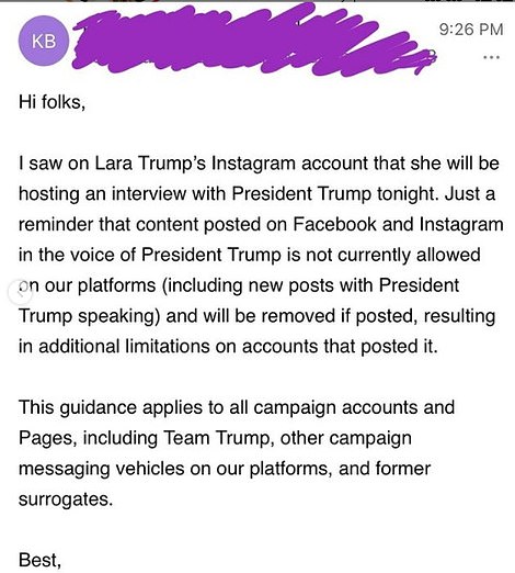Lara Trump planned on uploading her interview with Trump at around 9:30 pm. However, by 9:26 pm, her team received a breakthrough email from Facebook, where it revealed the shocking news of how the interview would not receive the permission needed for its airing on the social media giant platform.