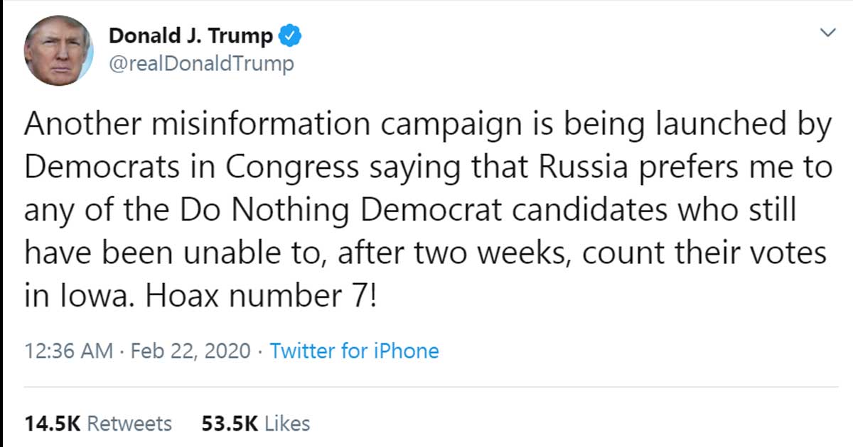 The comment was made after The New York Times wrote an article on Thursday claiming Acting DNI Joseph Maguire’s aide informed the House Intelligence Committee that Kremlin plans to aid Trump to win reelection.