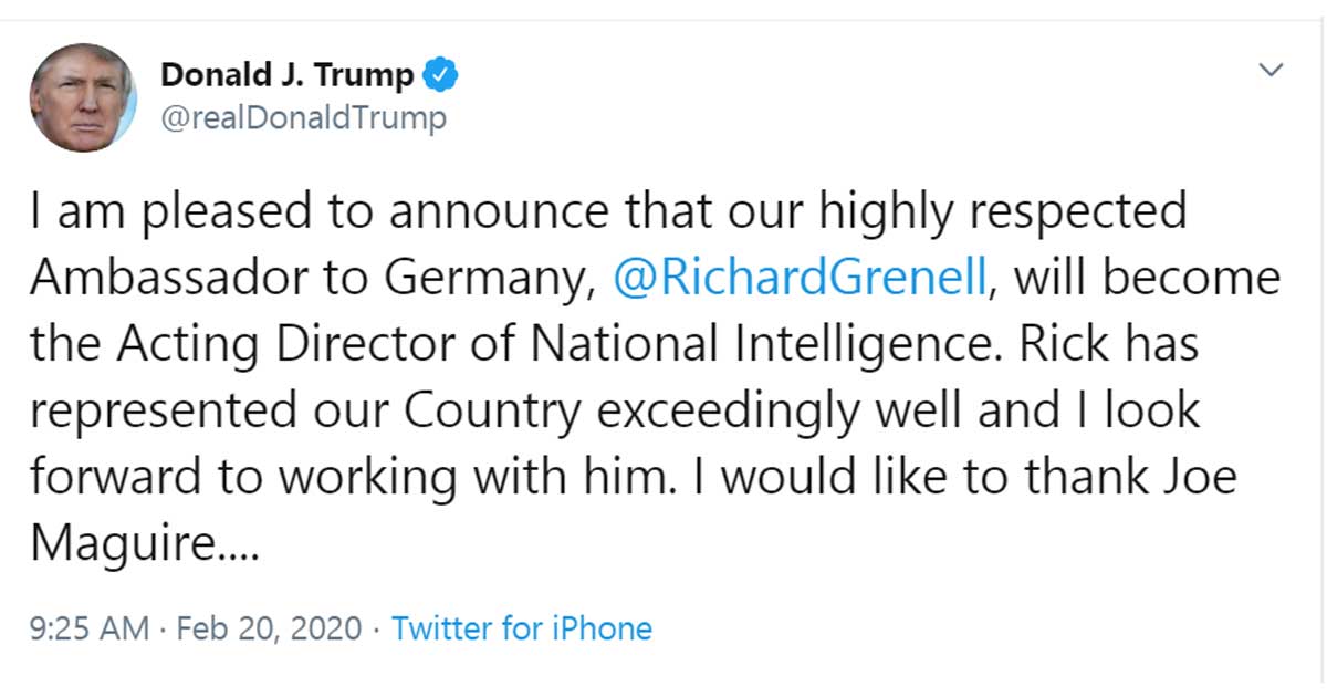 Donald Trump made an announcement on Wednesday that one of his closest loyalists, Ambassador Rick Grenell will be the new acting intelligence chief.