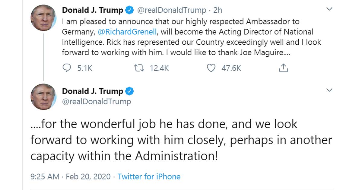 Trump also expressed his gratitude to outgoing director Joseph Maguire “for the wonderful job he has done, and we look forward to working with him closely, perhaps in another capacity within the Administration!”