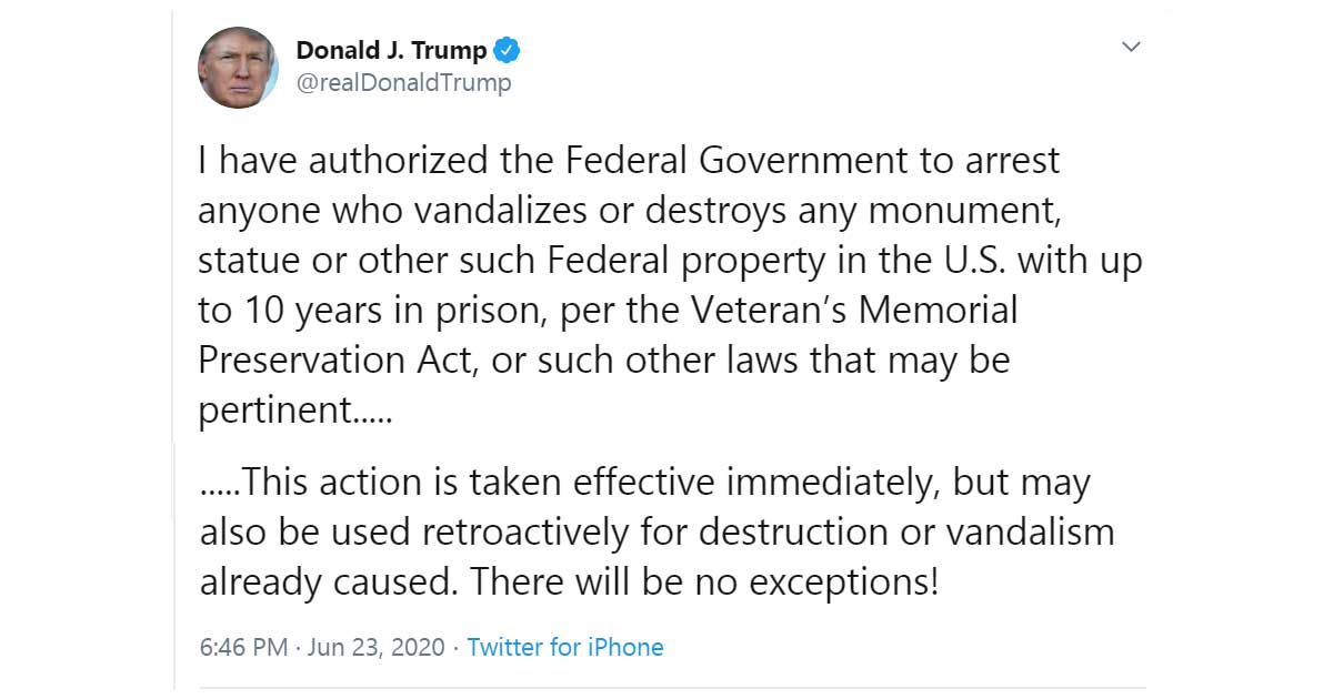 However, the President claimed that the new act shall “authorize the Federal Government to arrest anyone who vandalizes or destroys any monument, statue or other such Federal property in the U.S. with up to 10 years in prison.”