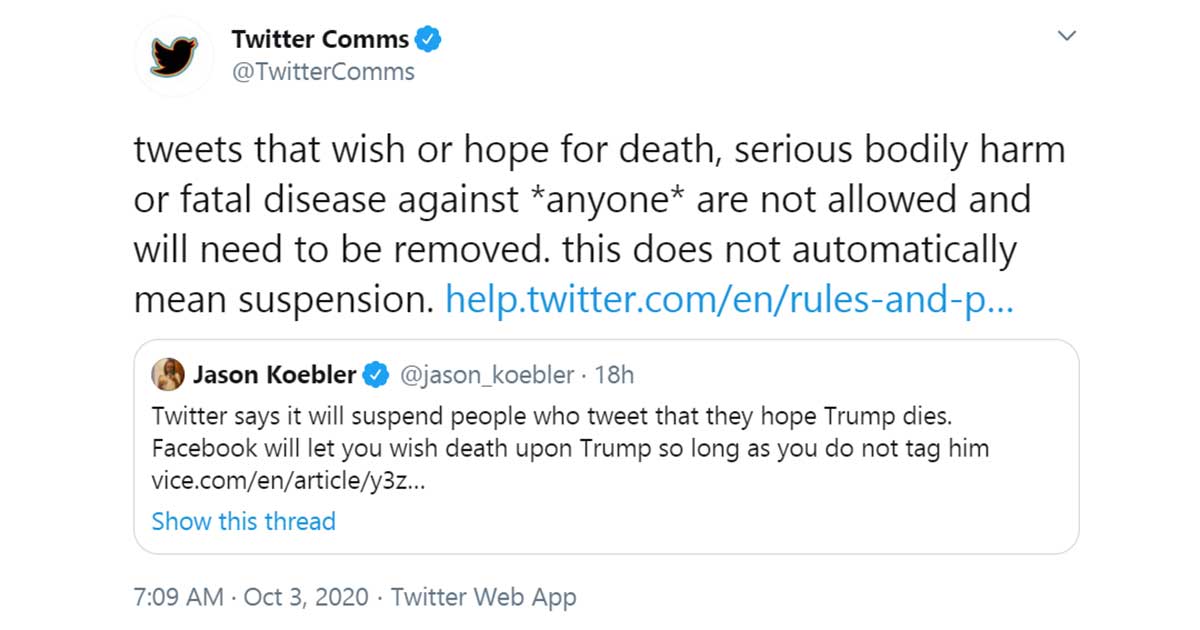 “[T]weets that wish or hope for death, serious bodily harm or fatal disease against *anyone* are not allowed and will need to be removed. this [sic] does not automatically mean suspension,” Twitter posted from its communication account.