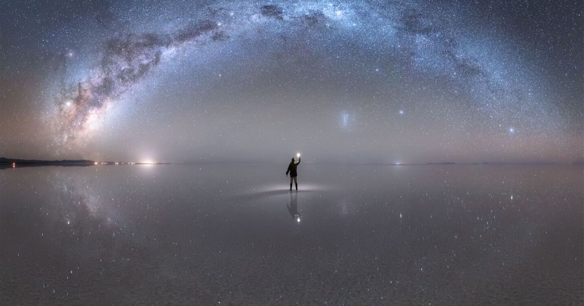 “The Sun can be seen both above and below the cloud deck, with the latter reflected in the calm lake. As a bonus, if you look really closely – and this is quite a challenge – you can find another airplane in the image, likely also on approach to the same airport.”