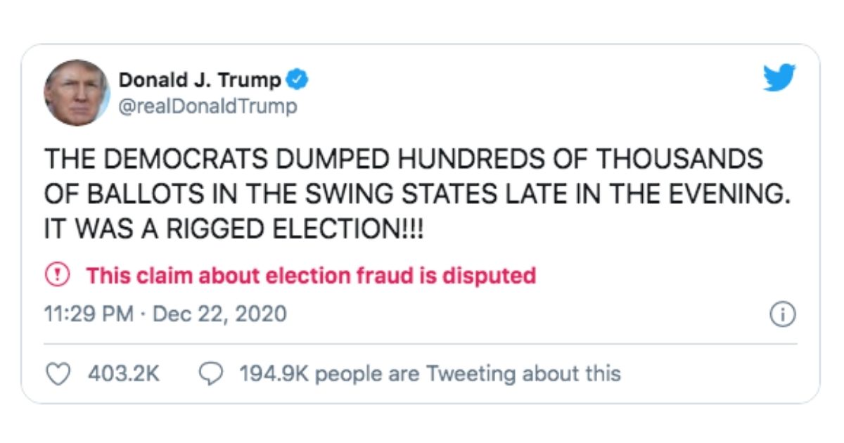 Trump’s tweet was flagged by Twitter with a disclaimer that reads: “This claim about election fraud is disputed.”