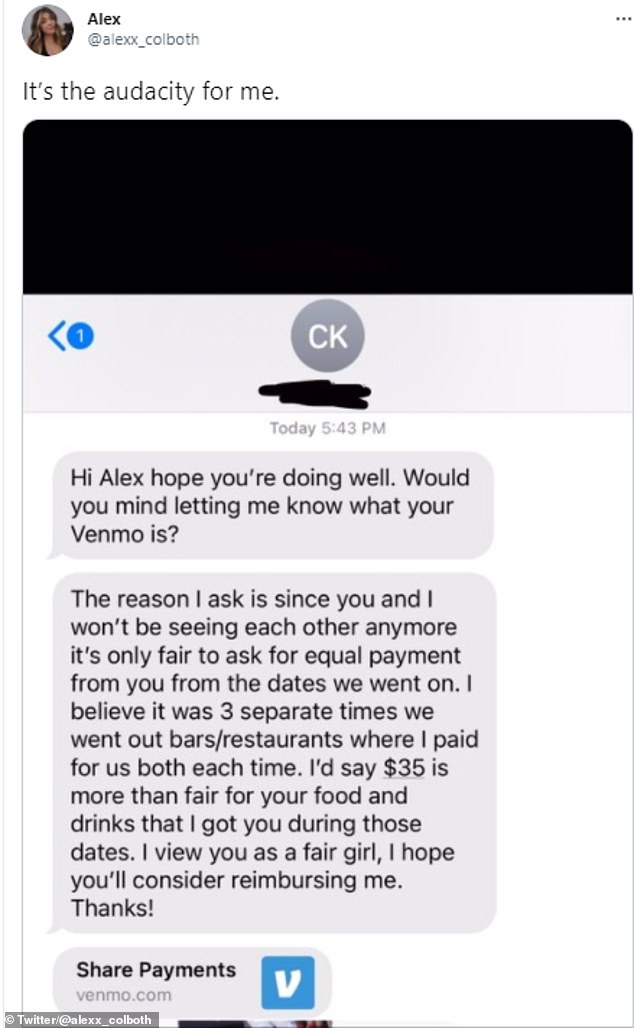 His daring message mentioned: “Hi Alex, hope you’re doing well. Would you mind telling me about your Venmo? The reason I’m asking is that since we won’t be seeing each other any longer, it’s just fair that I ask for the half amount of the dates that we went on.”